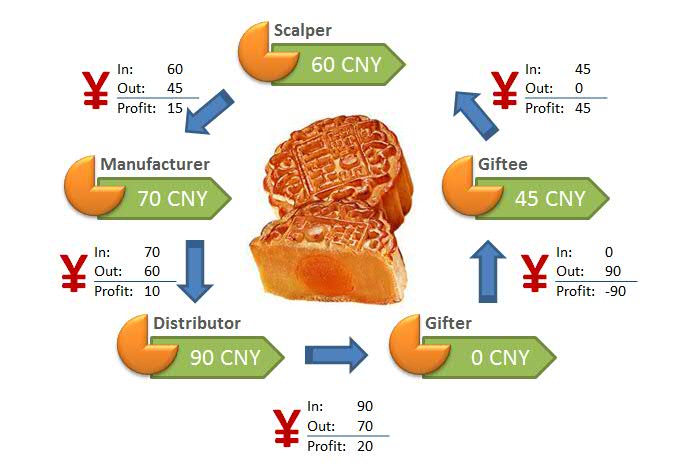 As you can see, the gifter was the only person who actually paid for the coupons, and all the other parties made some kind of profit off of it. Throughout this whole process, no moon cake was actually made! Pretty ingenious if you ask me.