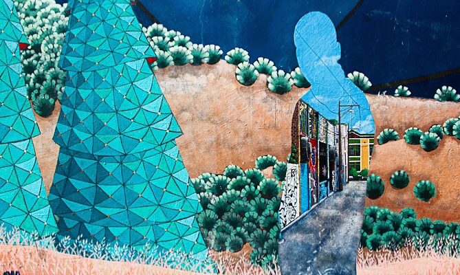 I’m ending street art week with one of my favorites, a long standing piece that’s hidden in the alley between Valencia and Mission streets, less than two blocks from where I used to live. I love the burst of colors, the use of repeating geometric patterns, and most of all, the man’s silhouette that encases a snapshot of this very alley at the time this piece was created.