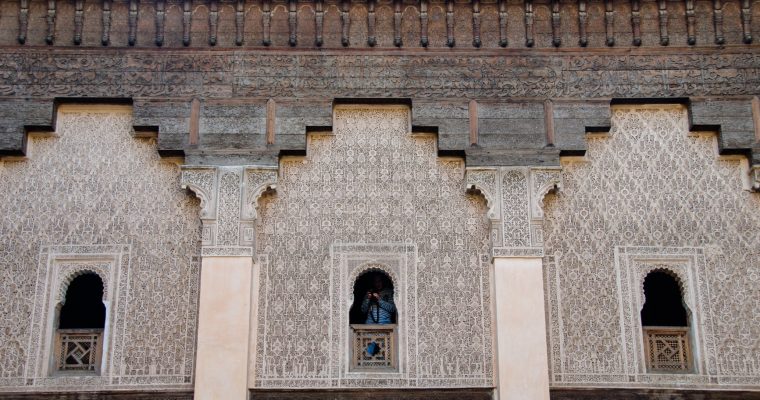 The Ben Youssef Madrassa was one of the largest Islamic colleges in Northern Africa. It’s shaped like a hallow rectangle, with 130 student dormitory cells surrounding a large courtyard. The courtyard is spacious, with beautiful blue skies above, the absolution pool in the middle, and everywhere you look, intricate wood carvings and colorful tiles on the walls. Inscribed above its entrance is the quote “you who enter my door, may your highest hopes be exceeded,” a blessing that must have invigorated students coming through its doors over the past five centuries.