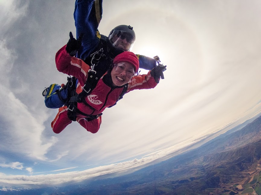 And jump out of a perfectly good airplane from 15,000 feet! I have to say, Skydive Lake Wanaka has a pretty catchy slogan going for them. So catchy in fact, that I bought a t-shirt with that on it, after I completed the feat. Surprisingly enough I wasn't nervous at all going into it. I had planned to skydive a few days earlier in Lake Taupo but weather did not cooperate, which worked out well for me as I ended up skydiving with four of my tour mates in Lake Wanaka instead. It was the morning after Christmas and most of the town was still closed. We took a short bus ride to the other side of Lake Wanaka, and signed yet another waiver of irresponsibility before getting into our lovely red jumpsuits that's almost as flattering as all the wetsuits we've been wearing the past few days. While we waited we even played a game of foosball. If anyone were nervous they definitely weren't showing it :P We were then introduced to our tandem skydive instructors, or "beautiful strangers", as I called mine. Whether they are actually beautiful is up to debate, but I'm willing to call anyone beautiful if I'm going to be up close and personal with them while jumping out of an airplane. The little red plane we are flying in was just that -- little. Since three of us wanted videos of our experience, we ended up packing 13 people into the plane plus the pilot. Let's just say I will never complain about leg space again. The view from the plane was absolutely gorgeous. We flew from the bank of the Crutha River, which winds and twists through the wide open valley between the two lakes, Wanaka and Hawea. The water is so clear that we can still see the rocks that lined its bottom from a few thousand feet up. Guarding the valley and lakes were the mountain range of Buchanan's and Mount Alba, where a heli-snowboarding challenge is held every year. I enjoyed this for a bit, while acutely aware of how much higher we are going. It didn't help that we had to wear oxygen masks as we got higher. As we ascended my beautiful stranger (he has a name, I think it's Alan) strapped me in and I found it surprisingly comforting to be so very attached to a stranger. One of our mates Josh opted for the 12,000 feet jump. The instructor nonchalantly said that we would drop him off at 12,000 feet and just keep going up, which was a very appropriate description. When we got to 12,000 feet, someone opened the door, and off they went! Not much warning, fanfare, and we didn't even get to wave goodbye. Some time between that and reaching 15,000 feet, someone let out a really stinky fart, and in a closed cabin that was NOT a good feeling! So in the midst of the ordeal where people hurried to open the little air holes, we reached 15,000 feet. The next few minutes (or maybe just 2 minutes) went by like a blur. The door opened, we slipped to the side, I held on tightly to my shoulder straps and put my feet under the plane, then put my face as closely to my instructor's head as I could manage, and then before I could manage a protest, I was shoved out of an airplane! The first two seconds were probably the scariest as I was painfully aware of the fact that I just got shoved out of a perfectly good airplane and free falling against some very strong wind. Then it occurred to me that I was very far from the ground and it didn't seem to approach at any dangerous speed at all, and I became very excited knowing that I just "jumped" out of a perfectly good airplane at 15,000 feet. I started screaming and shouting random stuff (such as "hi mom" and "go longhorns"), and tried to make as much arm movements as my frequently dislocating shoulders would allow me. Then, the parachute went up, and we began slowly floating back to earth with a very pleasant ride and view. Skydiving is one of those experiences that you can't quite put into words, and no matter how many pictures or videos you watch, you won't able to understand it until you've done it once. And everyone should at least do it once! When I got back on the ground, I didn't feel dizzy or wobbly, but when I had to do some push ups later (long story, but we are not allowed to say the word "mine" on this tour), my arms were completely sore because of the lack of adrenaline left in the system. Let's just say this is one bucket list item I wouldn't mind checking off a few more times! We started our drive to Franz Josef, the final stop of my tour in the afternoon. Along the way there was a bridge, probably 15 feet high, and I was challenged to jump off of it into a beautiful clear blue river. That was actually a much scarier experience than jumping out of an airplane, and now I have bruises on both the inside (from the harness for the parachute) and the outside (from hitting the water sideways) of my legs as badges of honor for my feats. And with that awesome WTFamIdoing face, I think I've fulfilled my free fall quota for the day (or year). Until next time!