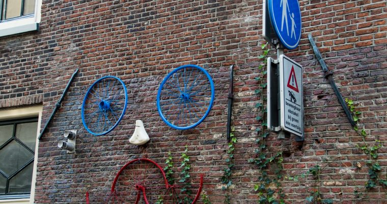 Deconstructed bike on a wall! Did you notice the seat nose? Love the creativity (although the framing of this photo REALLY needs work).