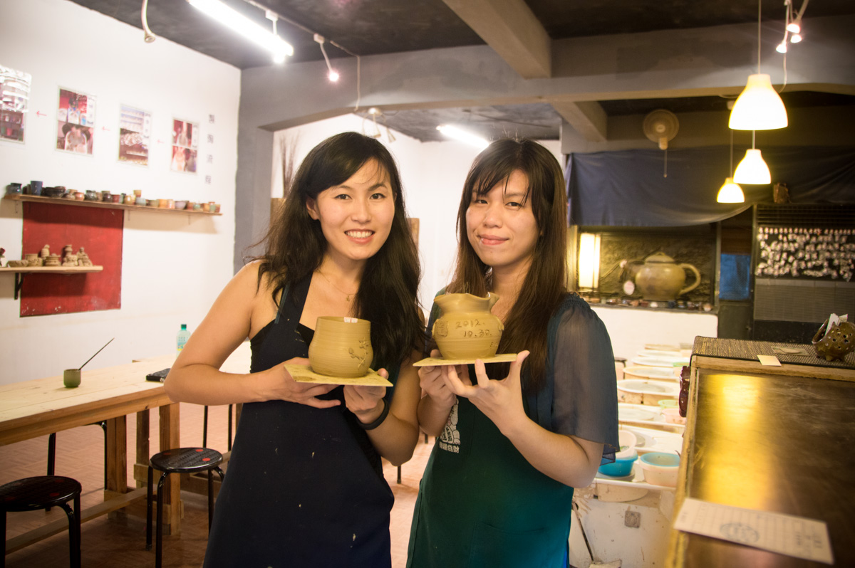 Yingge (鶯歌) is a small town on the outskirts of Taipei known for its ceramics. I met up with my friend Sharon and we arrived on a empty, old street on an almost sunny afternoon and was not too impressed by what we saw first. We passed by a few pottery shops with very cute figurines. We followed the signs to the Yingge Ceramics Museum, a modern four story building that actually seems a bit out of place in the old town. The entrance is free and you get to see some beautiful works of art, the history of ceramics in Yingge, and if you like, you can also take a lesson with a teacher and make your own. After looking at some beautiful and some interesting (what's up with the rabbit and the girl? @_@) works by others, we were ready to try our own skills! It started raining again as we left the museum, and by the time we trekked to the Old Street, a quaint little area of town with a stone paved walkway and ceramics stores and studios lining both sides. I would have taken a picture, if I weren't getting soaked -__- All complaints aside, we finally made it to the ceramics studio! Our teacher was great and showed us how easy it was to mold this little block of wet mud into all these wonderful shapes. Every one of these shapes took him 5 seconds. Maybe 2. Then it was our turn! I'll skip all the gory details (especially since my hands were too dirty to take any pictures), but basically after half an hour and 3 messed up blocks of clay, I made this! OK, the teacher helped. A lot. For some reason my clay keeps wanting to turn into abstract art when my intention was for it to become a classy tea cup. But anyway, it's now ready to be decorated! Tada! The final product! Oh hey, Stormy says hi. It'll take 2 weeks for the final product to arrive and we can't wait! :)