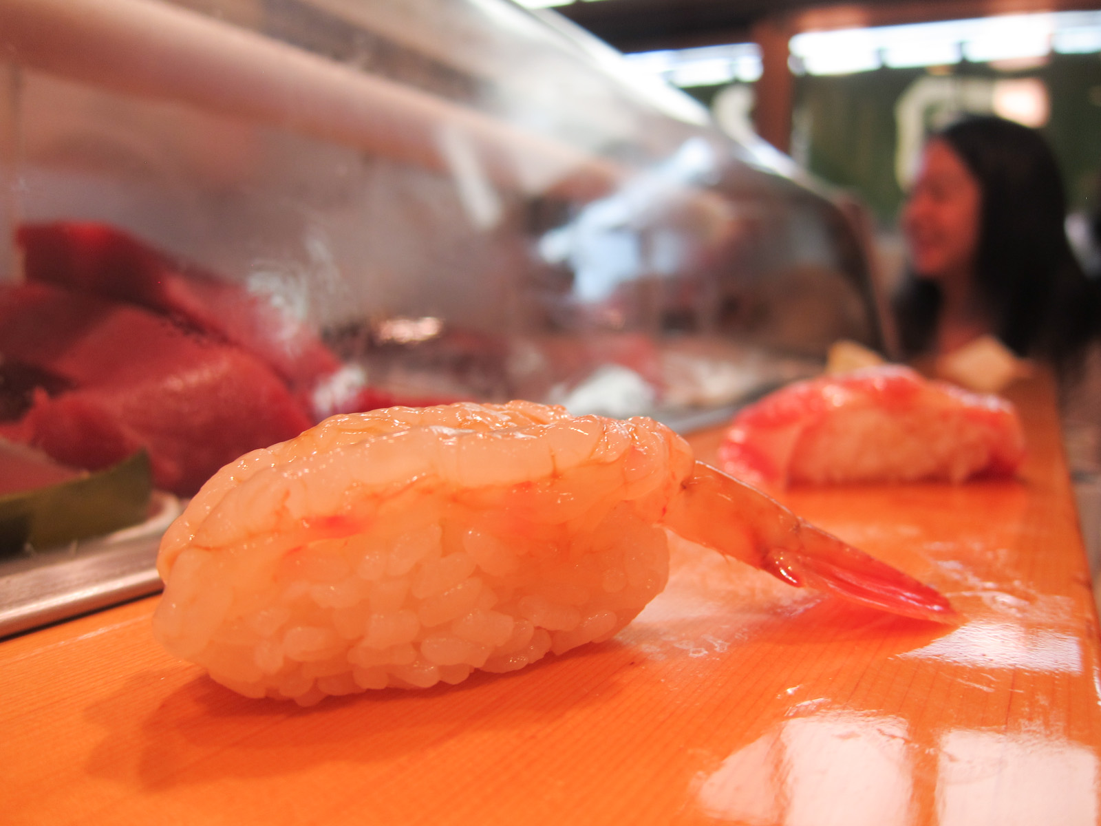 After we received all 10 pieces, we got to choose our extra piece off of the menu. Since we got to choose anything we wanted, I went for another piece of the fatty tuna, which is really the only thing that's better than 1 piece of amazing fatty tuna. And since Bryan was already full (I told him to hold off and not eat the rice ball!), I got to eat his extra piece too, and got the botan shrimp(ボタンエビ):D